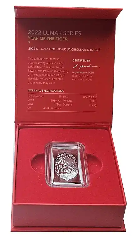 Start » Silbermünzen » 1/2 Oz Silberbarren Lunar Tiger Australien 2022 im Etui Versand Am Gleichen Tag