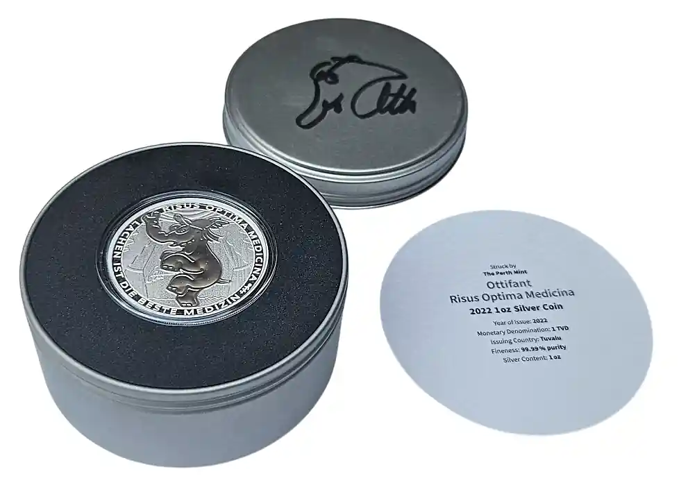 1 Oz Silber Ottifant 2022 – Lachen ist die beste Medizin Silbermünze Tuvalu – Blechdose Unterschrift