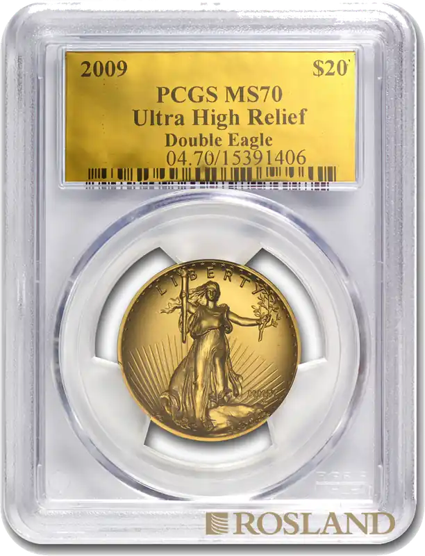 Diese wunderschöne Goldmünze 1 Unze Goldmünze American Eagle 2009 PCGS MS-70 (HR, Gold Label) mit der Prägequalität High Relief aus dem Jahr 2009 besitzt einen Edelmetallanteil von 99,99% Feingold, sowie ein Feingewicht von 31,10g und wird mit einer Stüc…