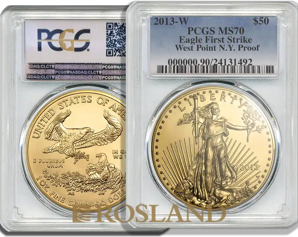 Diese wunderschöne Goldmünze 1 Unze Goldmünze American Eagle 2013 PP PCGS MS-70 (W, FS) mit der Prägequalität First Strike aus dem Jahr 2013 besitzt einen Edelmetallanteil von 91,66 % Feingold, sowie ein Feingewicht von 31,10g und wird mit einer Stückelu…