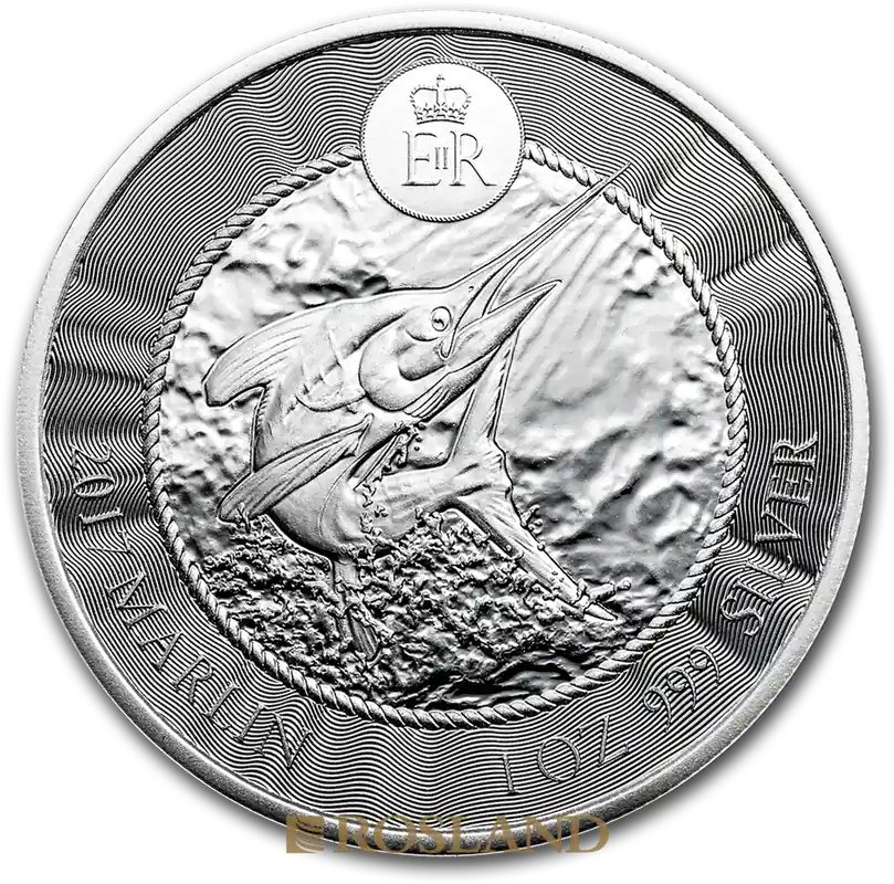Diese wunderschöne 1 Unze Silbermünze Cayman Islands Marlin (Sperrfisch) 2017 mit der Prägequalität Stempelglanz aus dem Jahr 2017 besitzt einen Edelmetallanteil von .9999 Feinsilber, sowie ein Feingewicht von 31,10g und wird mit einer Stückelung von 1 U…