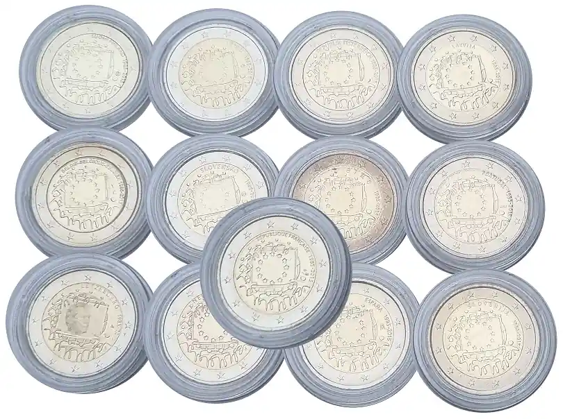 13 x 2 Euro Gedenkmünzen 30 Jahre Europaflagge aus diversen Länder in Münzkapseln