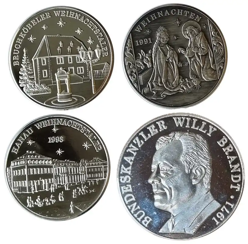 Start » Sale % » 4 Silbermedaillen 65 gr 999/1000 Feinsilber ( 3 x Weihnachtstaler 1 x Willy Brandt ) Kostenloser Rückversand
