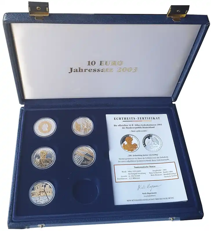 5 x 10 Euro Silber Gedenkmünzen 2003 mit Goldapplikation in Münzkassette Mega-Angebot