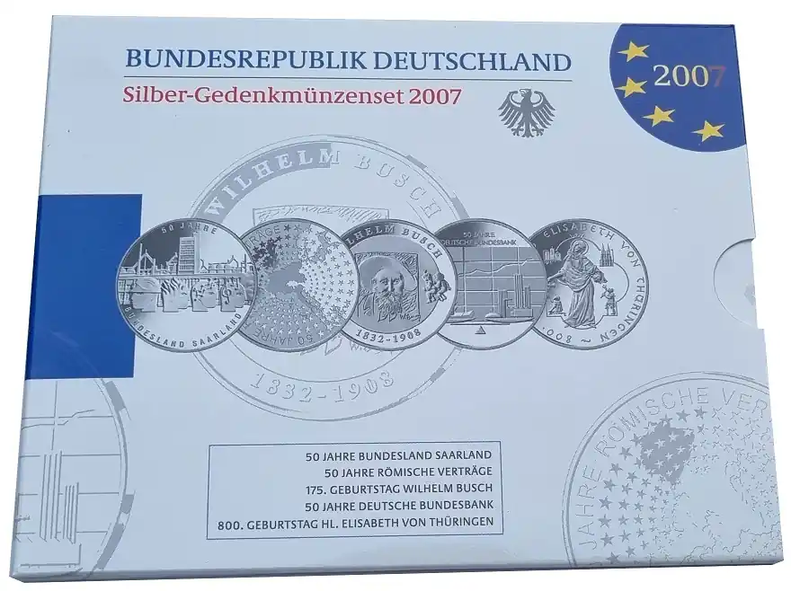 5 x 10 Euro Silber Gedenkmünzenset Deutschland 2007 Spiegelglanz im Folder Sonderaktion