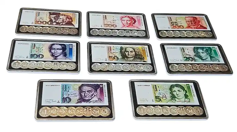 8 x 1 Oz Silberbarren Komplettsatz. Zum Gedenken an die Deutsche Mark
