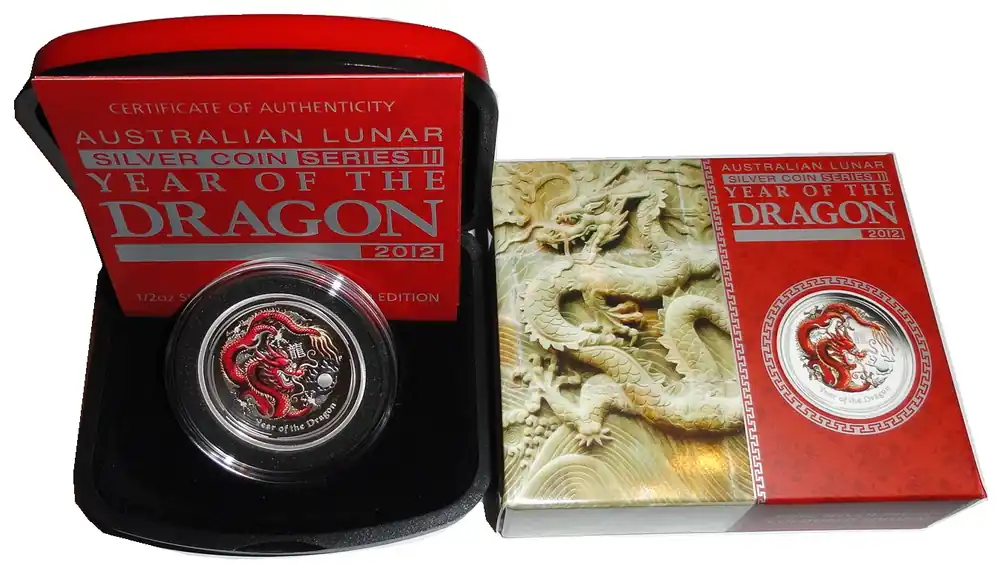 Start » Silbermünzen » Australien 1/2 Oz Silber Lunar Drache II 2012 Farbe im Etui Neuheit