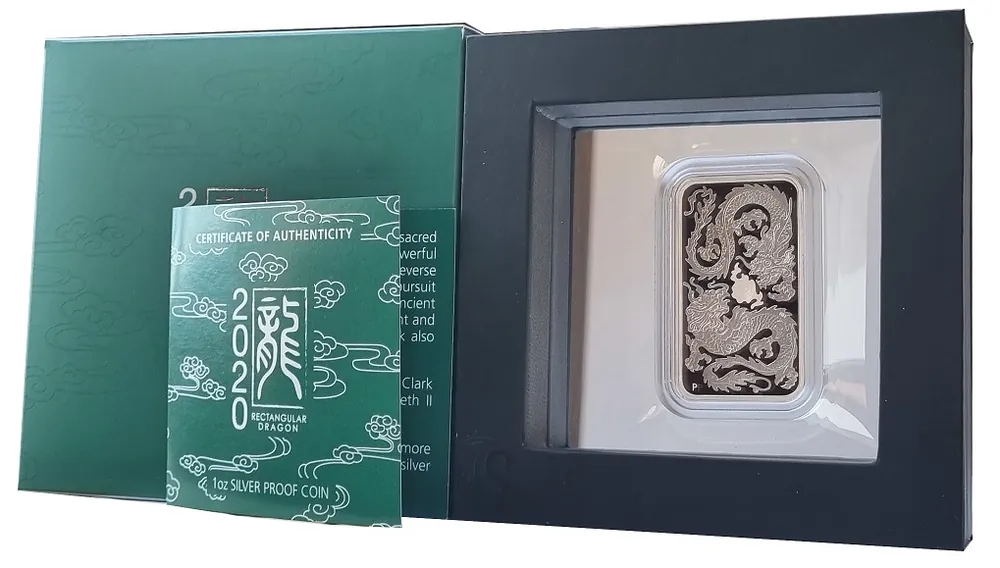 Australien 1 Oz Silberbarren Drache rechteckig – Rectangular 2020 Perth Mint – Polierte Platte Etui