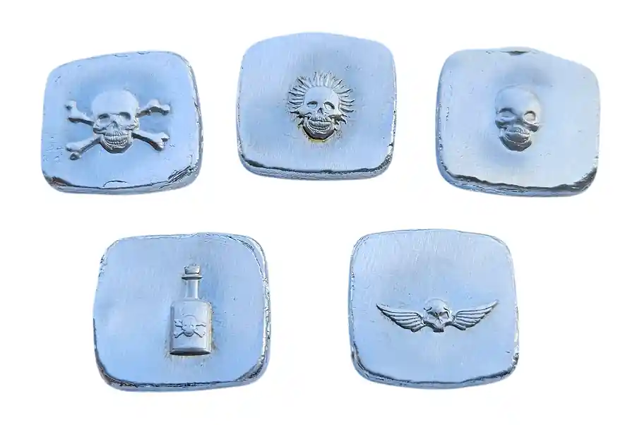 Start » Silberbarren » Ausverkauf BeKo Edelmetalle 5 x 20 Gramm Silberbarren – Totenkopf Barren High Relief – Sparpaket!