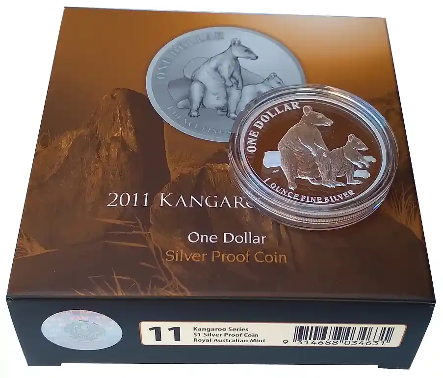 B-Ware 1 Oz Silber Känguru 2011 im Etui – PP Polierte Platte aus Australien