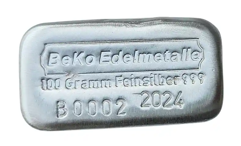 BeKo Edelmetalle 100 Gramm Silberbarren 999 Feinsilber (gegossen) 2024 Seriennummer 2