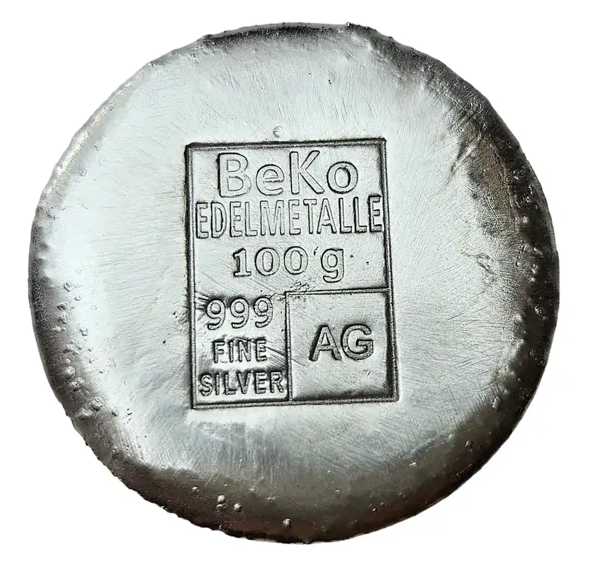 Start » Silberbarren » BeKo Edelmetalle 100 Gramm Silberbarren – Rundbarren 999 Feinsilber (gegossen) Sammlerbarren Handgefertigt