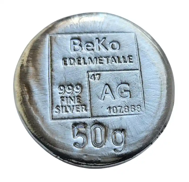 BeKo Edelmetalle 50 Gramm Silberbarren – Rundbarren 999 Feinsilber (gegossen) Sammlerbarren
