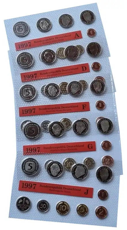 Start » Sale % » BRD 5 x 12,68 DM Kursmünzensatz ADFGJ 1997 – Original Noppenfolie Markenprodukt