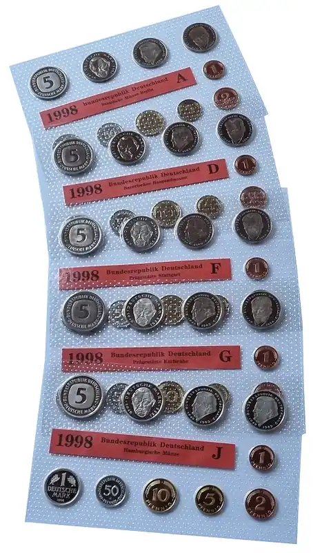 BRD 5 x 12,68 DM Kursmünzensatz ADFGJ 1998 – Original Noppenfolie