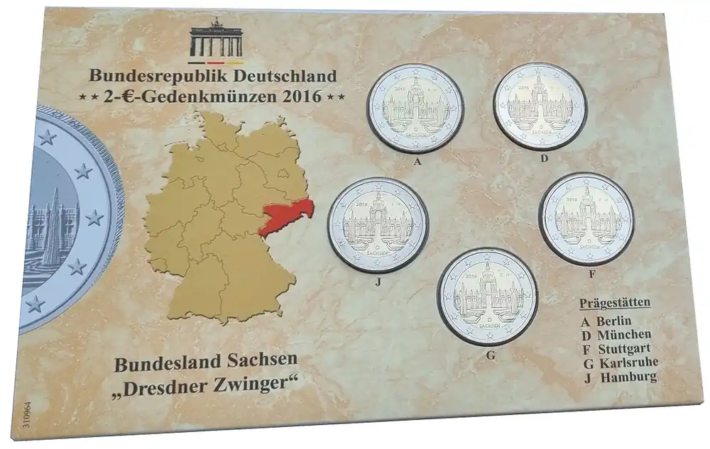 BRD: 5 x 2 Euro Münzen ADFGJ Dresdner Zwinger 2016 im Folder