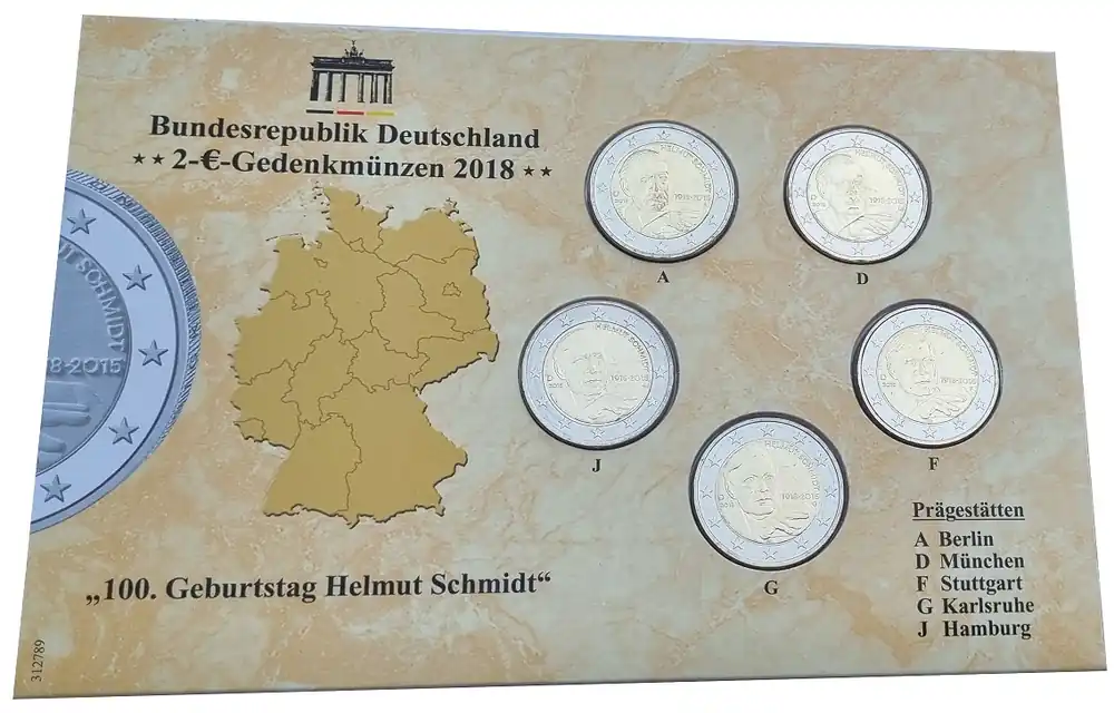 BRD: 5 x 2 Euro Münzen ADFGJ Helmut Schmidt 2018 im Folder Expressversand