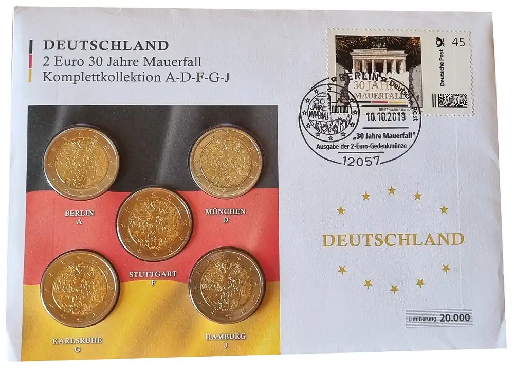 Start » Euromünzen » BRD: 5 x 2 Euro Münzen ADFGJ Mauerfall 2019 Numisbrief mit Briefmarke u. Sonderstempel Kostenloser Rückversand