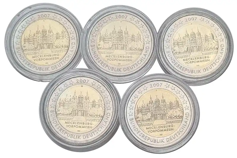 BRD: 5 x 2 Euro Münzen ADFGJ Schweriner – Schloss 2007 lose Bankfrisch in Münzkapseln Beliebt