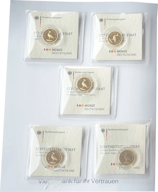 BRD: 5 x 20 Euro Goldmünzen Weißstorch 2020 ADFGJ Stgl Komplettsatz