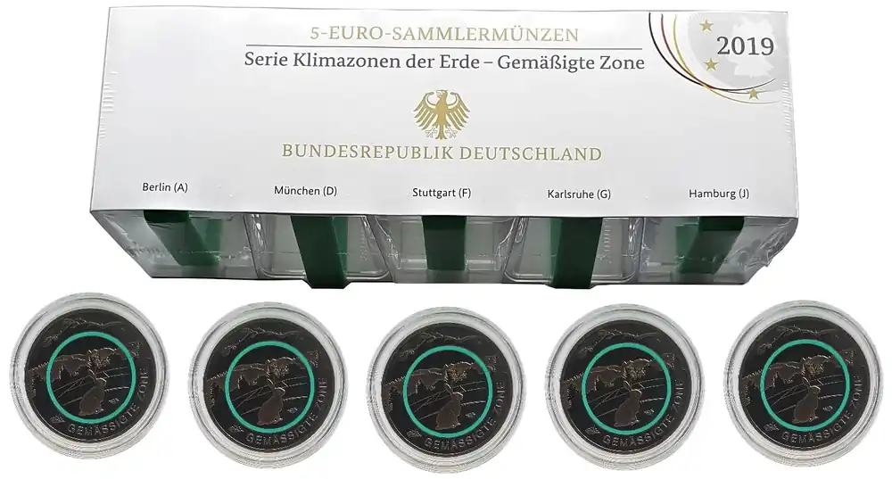 Start » Euromünzen » BRD: 5 x 5 Euro Gemäßigte Zone 2019 ADFGJ PP Polierte Platte zum Ausgabepreis! Preiswert