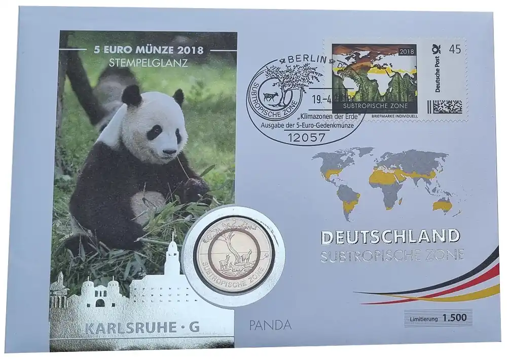 Start » Euromünzen » BRD: Numisbrief Panda – 5 Euro Bimetall Subtropische Zone G mit Polymer – Ring 2018 Super-Preis
