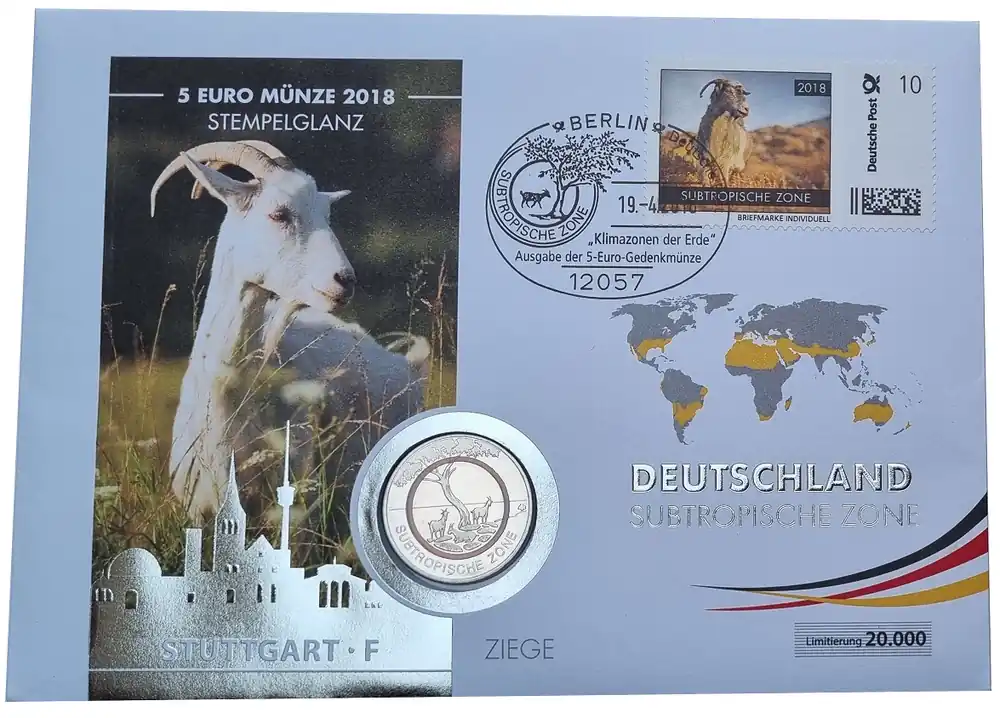 BRD: Numisbrief Ziege – 5 Euro Bimetall Subtropische Zone F mit Polymer – Ring 2018 Markenprodukt