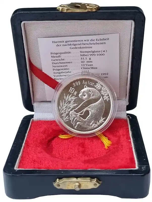 China 10 Yuan 1 Oz Silber Panda 1993 Stempelglanz – Münzkapsel im Etui Mega-Angebot