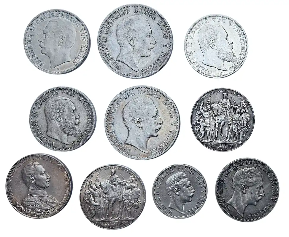 Start » Silbermünzen » Deutsches Kaiserreich Silbermünzen Lot 2 x 5 Mark, 7 x 3 Mark u. 1 x 2 Mark Abverkauf