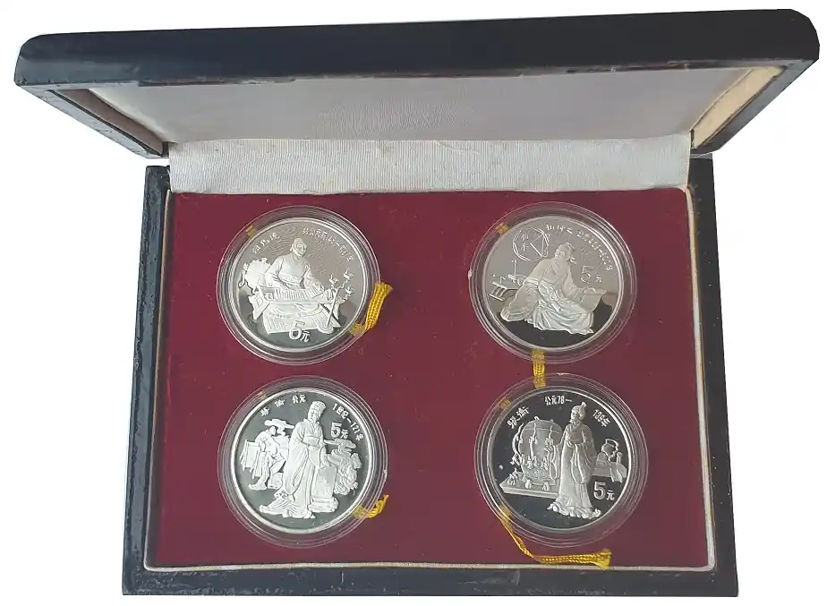 China 4 x 5 Yuan Silber Große Persönlichkeiten 1986 Polierte Platte mit Etui
