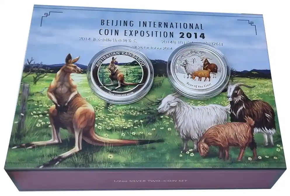 Finale Aktion Australien 2 x 1/2 Oz Silbermünzen – Set (Känguru + Ziege) Farbe Beijing International Coin Show