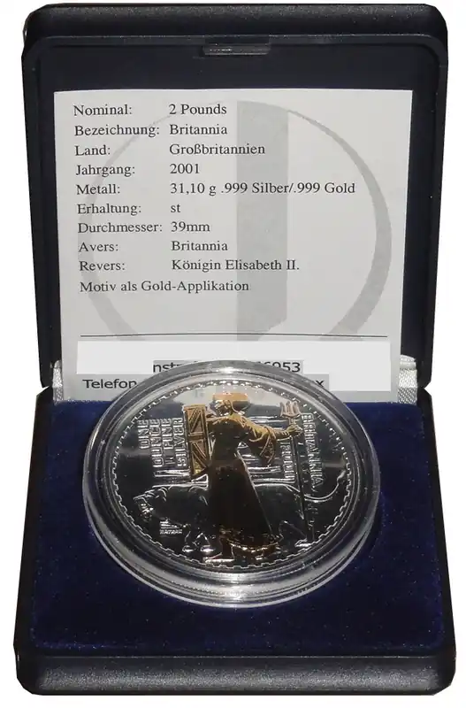 Start » Anlagemünzen » Großbritannien 2 Pounds 1 Oz Silber Britannia 2001 vergoldet (Gilded) Versand Am Gleichen Tag