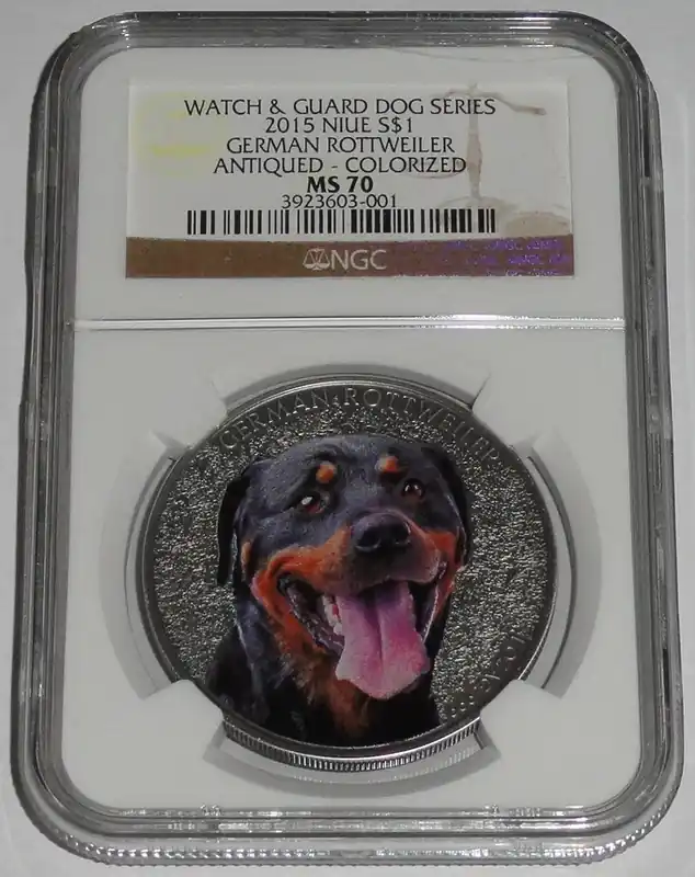 Niue 1 Dollar 1 Oz Silber German Rottweiler (Deutscher Rottweiler) Farbe NGC MS-70