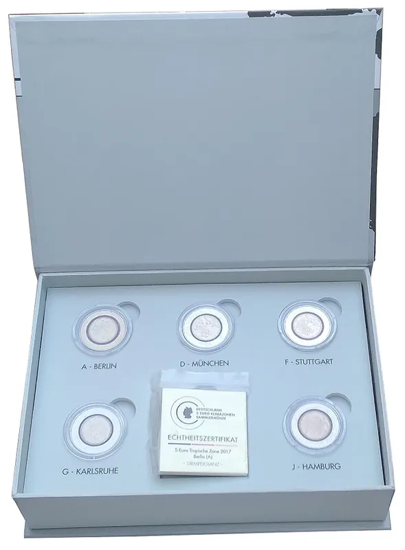 Start » Euromünzen » Günstig BRD: 5 x 5 Euro Tropische Zone ADFGJ 2017 Stempelglanz in LED – Kassette