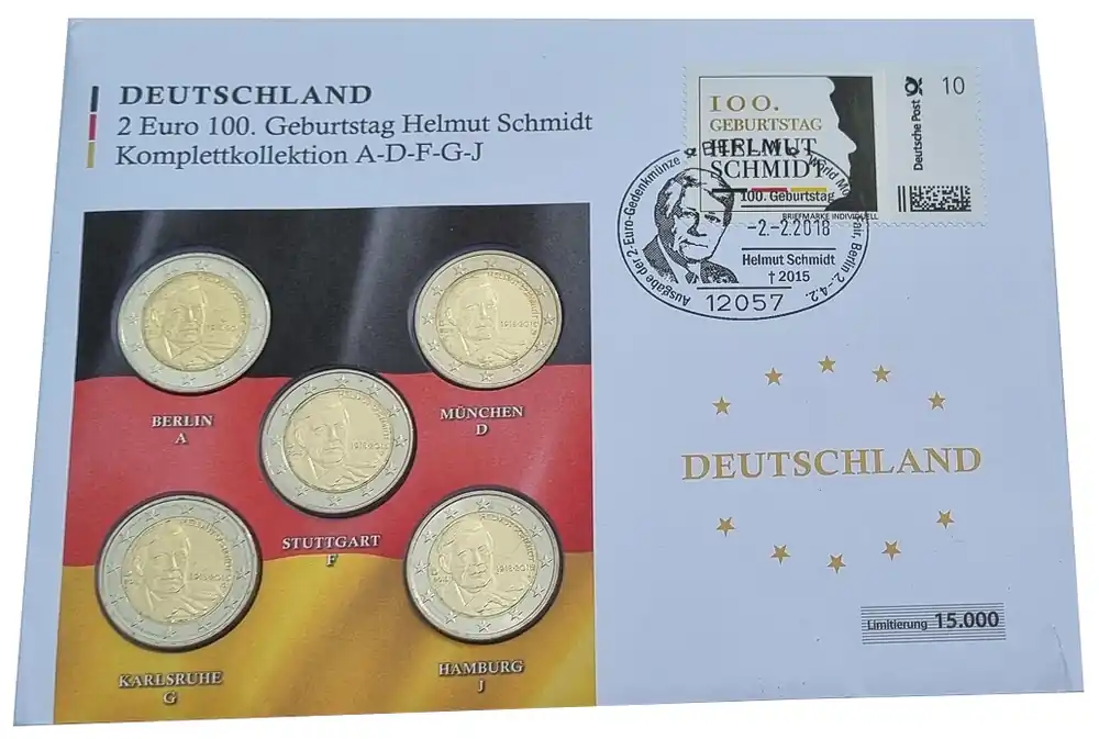 Start » Euromünzen » Highlight BRD: 5 x 2 Euro Münzen ADFGJ Helmut Schmidt 2018 Numisbrief mit Briefmarke u. Sonderstempel