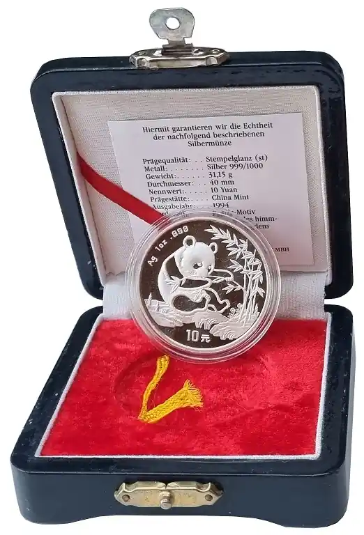 Start » Silbermünzen » Highlight China 10 Yuan 1 Oz Silber Panda 1994 Stempelglanz – Münzkapsel im Etui