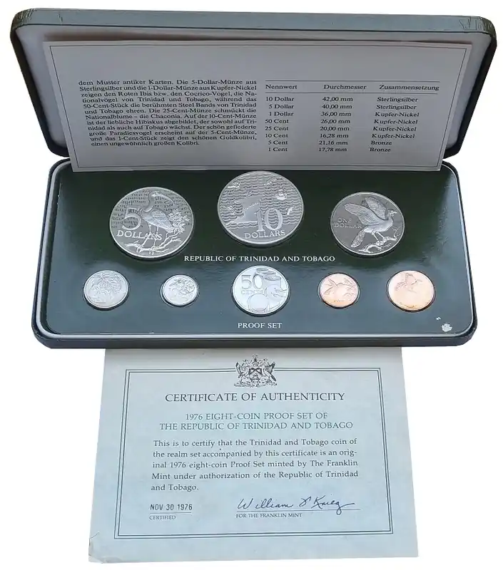 Trinidad and Tobago 1 Cent bis 10 Dollars Proof Set 1976 mit 2 Silbermünzen im Etui