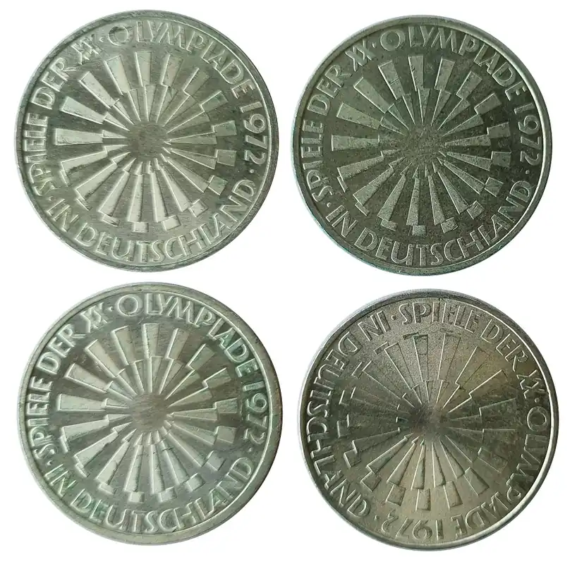 BRD: 4 x 10 DM Silber DFGJ Strahlenspirale Olympiade 1972 München
