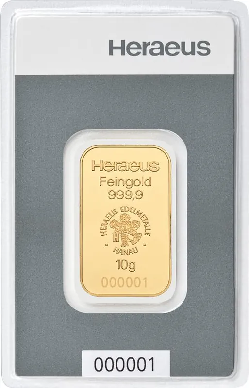 Herkunftsland:DeutschlandHersteller:HeraeusSerie:HeraeusFeingewicht:10 GrammFeinheit:999.9/1.000Blisterlänge:85,00 mmBlisterbreite:55,00 mmLänge:31,50 mmBreite:18,50 mmDicke:1,10 mmErhaltung:NeuwareVerpackung:Blisterkarte mit Zertifikat und Seriennummer