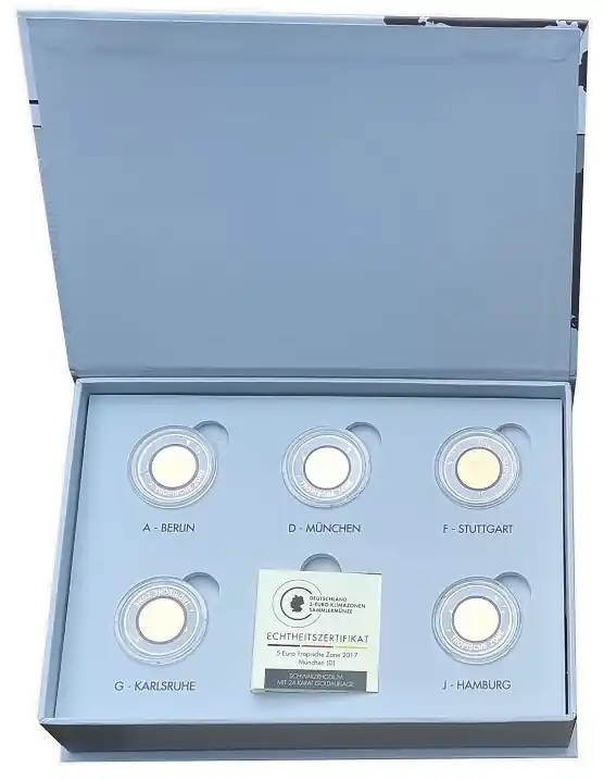 BRD: 5 x 5 Euro Tropische Zone ADFGJ 2017 mit Rhodium und 24 Karat Goldauflage in LED – Kassette