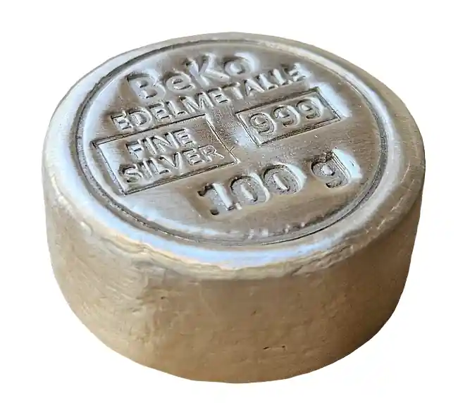 BeKo Edelmetalle 100 Gramm Rundbarren – (BeKo Button) 999 Feinsilber (gegossen) Sammlerbarren