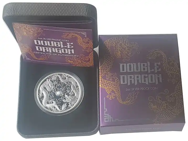 Jetzt Zugreifen 1 Oz Silber Double Dragon (Drache) 2020 PP - Polierte Platte im Etui aus Australien