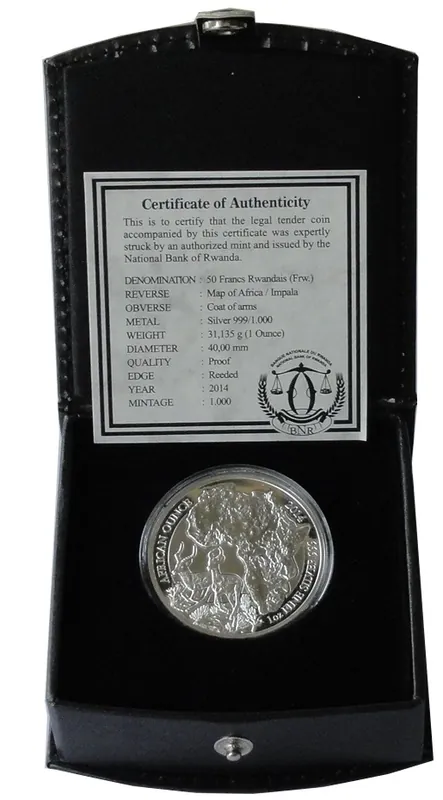 Start » Silbermünzen » Markenware Ruanda 1 Oz Silber Impala 2014 PP mit Etui und Zertifikat
