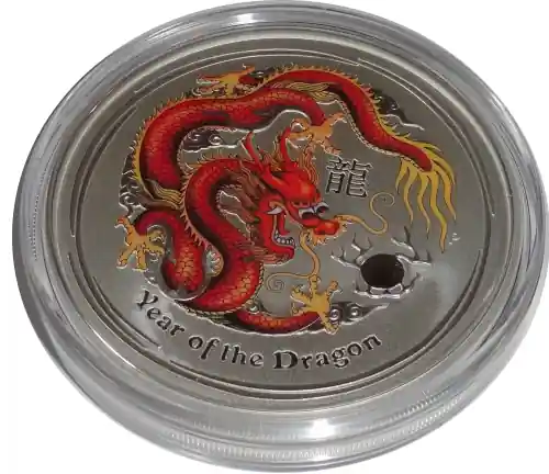 Start » Anlagemünzen » Mega-Angebot Australien 5 Oz Silber Lunar Drache II 2012 Farbe