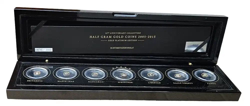 Start » Goldmünzen » Must-Have Gabun 7 x 0,5 Gramm Goldmünzen 2015 Platinum Edition Prooflike im Etui
