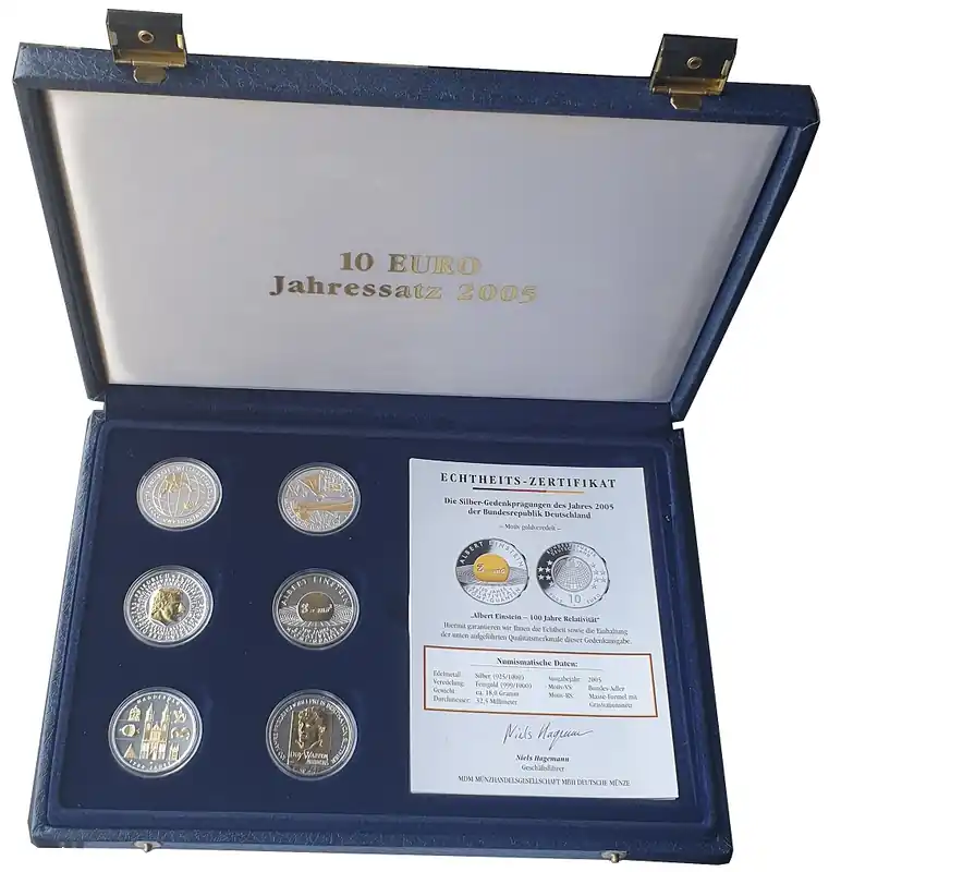 Neu Im Sortiment 6 x 10 Euro Silber Gedenkmünzen 2005 mit Goldapplikation in Münzkassette
