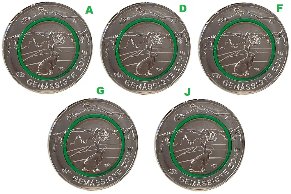 Start » Euromünzen » Neue Ware BRD: 5 x 5 Euro Gemäßigte Zone 2019 ADFGJ Stempelglanz