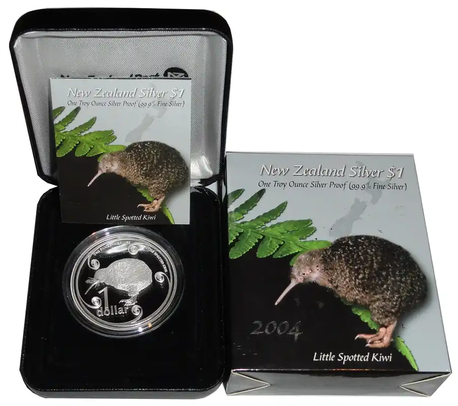 Start » Silbermünzen » Neuseeland 1 Oz Silber Kiwi 2004 PP Etui Sale