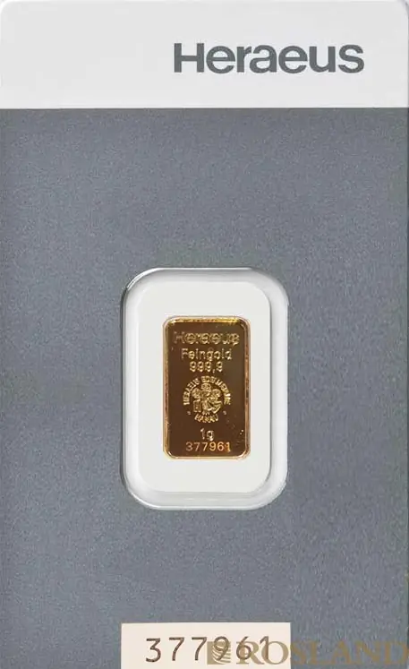 Dieser wunderschöne Barren 1 Gramm Goldbarren Heraeus besitzt einen Edelmetallanteil von .9999 Feingold, sowie ein Feingewicht von 1g und wird mit einer Stückelung von 1 Gramm in einer Blister mit Zertifikat ausgeliefert.