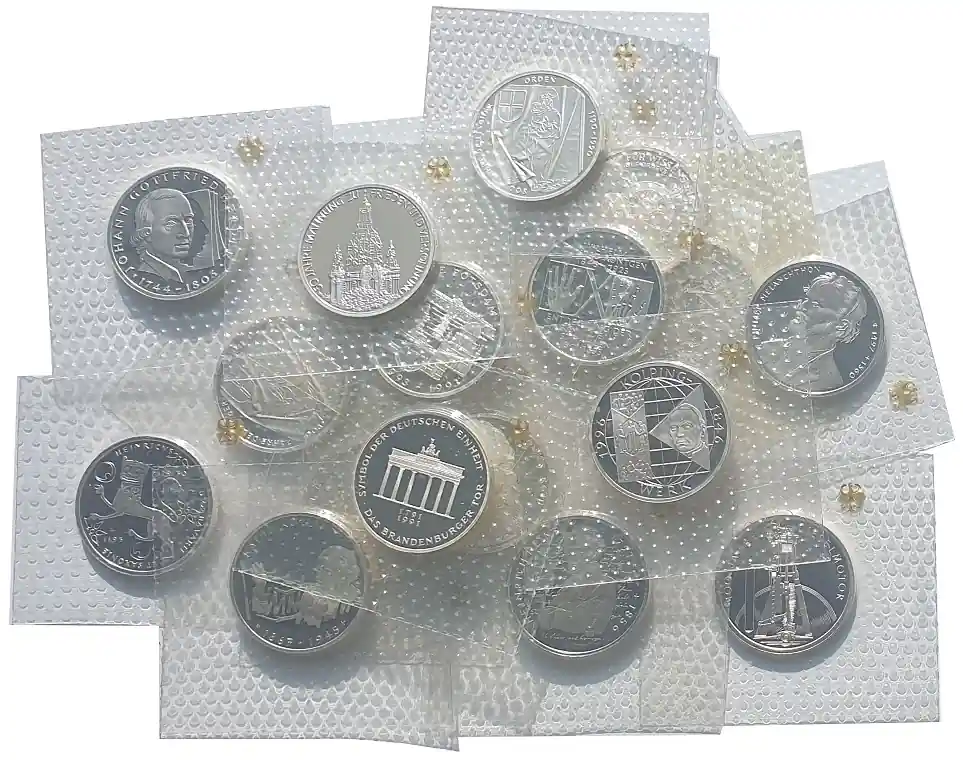 BRD: 10 DM Silber Gedenkmünzen 1987 – 1997 Spiegelglanz Noppenfolie